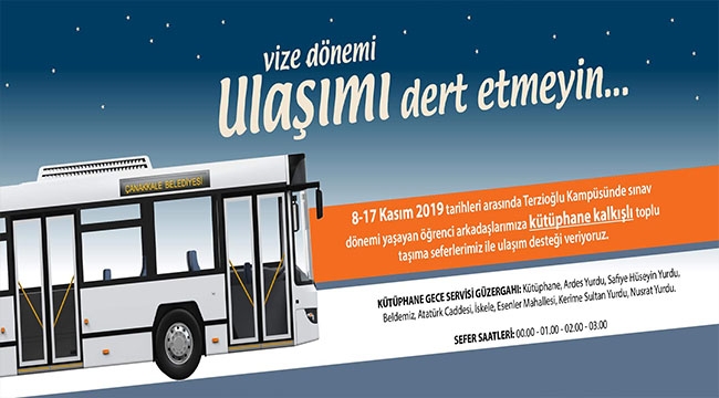 Çanakkale Onsekiz Mart Üniversitesi Terzioğlu Kampüsü içinde bulunan kütüphane binasında ders çalışan öğrencilere yönelik 17 Kasım 2019 tarihine kadar geçerli olacak düzenleme kapsamında; 00.00-01.00-02.00 ve 03.00 saatlerinde kütüphane kalkışlı olarak, Ardes Yurdu, Safiye Hüseyin Yurdu, Beldemiz, Atatürk Caddesi, İskele, Esenler Mahallesi, Kerime Sultan Yurdu ve Nusrat Yurdu güzergahında toplu taşıma seferleri düzenlenecek.