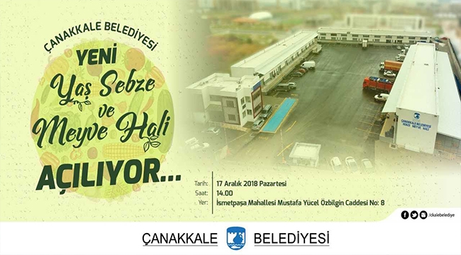 Günümüz koşullarına ve kentin ihtiyacına uygun olarak projelendirilen Çanakkale Belediyesi Yeni Yaş Sebze ve Meyve Hali, 17 Aralık 2018 Pazartesi günü saat 14.00’te İsmetpaşa Mahallesi Mustafa Yücel Özbilgin Caddesi No:8’de düzenlenecek açılış töreni ile hizmete giriyor.