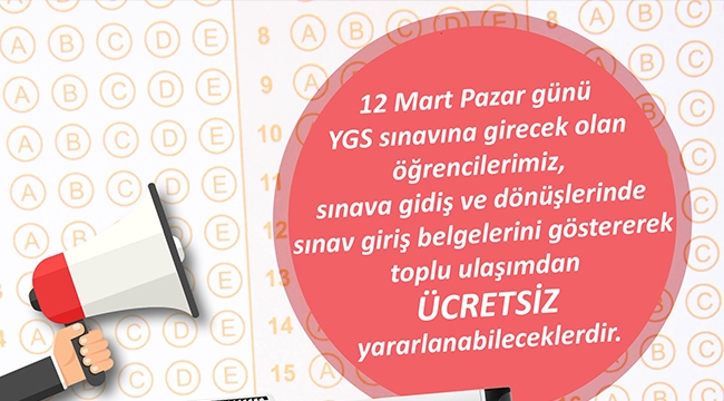 Bu nedenle 12 Mart 2017 tarihinde siyah plakalı belediye otobüsleri ve özel halk otobüsleri ile YGS sınav yerlerine gidecek ve sınav çıkışında evlerine dönecek adaylar, sınav giriş belgesini araç şoförüne ibraz ederek ulaşımdan ücretsiz olarak yararlanabileceklerdir.