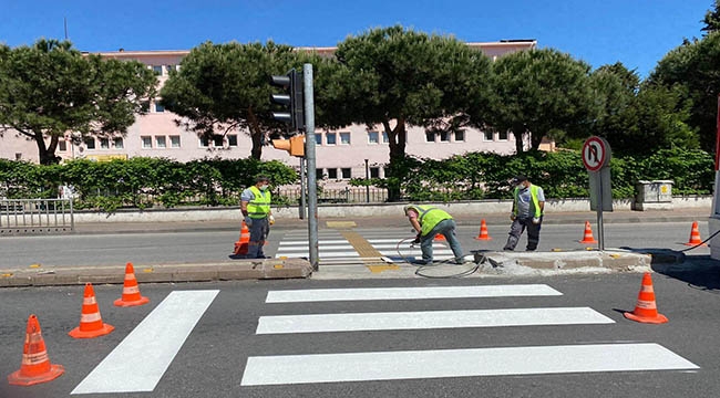 Çanakkale Belediyesi Ulaşım Hizmetleri Müdürlüğüne bağlı ekipler tarafından kent merkezinde yol çizgileri yenileniyor.