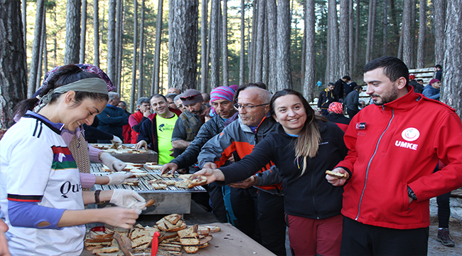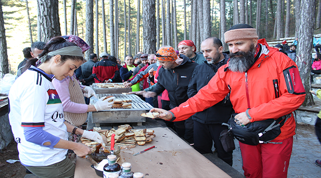 Şehitler anısına Kazdağları Tırmanışı için Bayramiç’e gelen 500’e yakın dağcı zorlu tırmanış öncesi ballı ekmek yiyerek enerji depoladı.